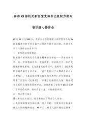 参加XX部机关新任党支部书记组织力提升培训班心得体会XX月XX日至XXX日,我参加了在红旗渠干部学院举办的XX部直属机关新任党支部书记组织力提升培训班,现将有关学习心得体会分享如下:一、参加培训基本情况红旗渠干部学院位于红旗渠精神的发祥地——河南省林州市,是一所集精神传承、党性教育、宗旨践行为一体的党性教育特色基地。在为期5天的培训中,我聆听了《红旗渠的修建及其历史启示》、《习近平新时代中国特色社会主义思想》、《基层组织建设的实践与思考》等专题讲座,观看了纪录片《红旗渠》,参观了红旗渠纪念馆、青年洞、谷文昌纪念馆等现场教学点,实地考察了安阳市XX局党建工作和建设成果,培训内容丰富,体验感悟深刻...