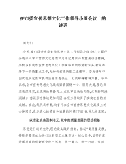 在市委宣传思想文化工作领导小组会议上的讲话同志们:今天,我们召开市委宣传思想文化工作领导小组会议,主要任务是深入学习贯彻文化思想和总书记考察山西重要讲话精神,分析当前我市宣传思想文化工作面临的新形势新任务,研究部署下一阶段重点工作,为加快打造新型工业强市、奋力谱写中国式现代化篇章提供坚强思想保证、汇聚磅礴精神力量。今年以来,全市宣传思想文化战线紧紧围绕中心、服务大局,理论武装走深走实,主流舆论昂扬向上,文化事业欣欣向荣,文明新风浸润城乡,意识形态阵地更加巩固,各项工作取得了实实在在的新成效。在此,我代表市委,向奋斗在全市宣传思想文化战线上的全体同志,表示衷心的感谢和诚挚的问候!下面,我讲几点意...
