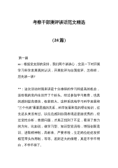 考察干部测评谈话范文精选(24篇)第一篇xx:根据党支部的安排,我们两个谈谈心,交流一下对开展学习科学发展观的认识,开展批评与自我批评。怎样样,您先谈一谈?**:这次活动对我来讲是十分难得的学习和提高的机会,这给我的党内生活开了个好头。经过参加学习教育,也真的感到提高很快,收获很大。这样系统地学习科学发展和“三个代表”重要思想的关系,科学发展和党的理论知识,过去还从来没有过。以往总感到自我表现还是挺优秀的,经过党性分析,查摆问题,才真正找到了不足,看清了努力的方向。比如说,做学习型、知识型党员啦,增强创新意识、进取精神啦,高标准、严要求啦,立足岗位处处发挥模范带头作用啦,等等。差距还大的很哩,...