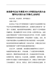 校党委书记在“共青团XX大学委员会代表大会暨学生代表大会”开幕式上的讲话各位代表,各位来宾,青年朋友们:大家上午好!在全省上下深入学习贯彻党的十九届五中全会精神和习近平总书记来考察重要讲话精神之际,在我校扎实推进“双一流”“四个一流”建设、稳步发展学校各项事业、谋划下个五年规划的关键时刻,我们隆重召开XXXX大学第一次团学双代会。这是全校共青团员和广大青年学生政治生活中的一件大事,也是新时期我校青年学生振奋精神、开拓进取的一次盛会。在此,我代表学校党委向大会的顺利召开表示热烈祝贺!向各位领导、各位来宾的到来表示诚挚欢迎!向各位代表,并通过你们向全校共青团员和广大青年学生致以最亲切的问候!过去几...