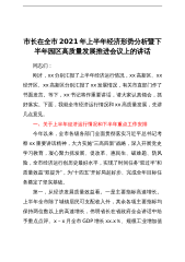 市长在全市2021年上半年经济形势分析暨下半年园区高质量发展推进会议上的讲话同志们:刚才,xx分别汇报了上半年经济运行情况,xx高新区、xx经开区、xx高新区分别汇报了xx发展情况,有关市直部门作了书面发言。等下,xx书记将作重要讲话,请大家认真领会,抓好落实。下面,我就全市经济运行情况和xx高质量发展,先讲几点意见。一、关于上半年经济运行情况和下半年重点工作安排今年以来,全市各级各部门全面贯彻落实习近平总书记考察xx重要讲话精神,大力实施“三高四新”战略,深入开展党史学习教育,凝心聚力抓发展、促改革、惠民生、破难题、防风险,全市经济运行创历史最好水平,实现了时间任务“双过半”和质量效益“双提...