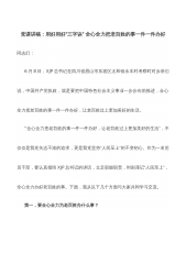 党课讲稿:用好用好“三字诀”全心全力把老百姓的事一件一件办好同志们:6月8日,XJP总书记在四川省眉山市东坡区太和镇永丰村考察时对乡亲们说,中国共产党执政,就是要把中国特色社会主义事业一步步向前推进,全心全力把老百姓的事一件一件办好,让老百姓过上更加美好的生活。“全心全力把老百姓的事一件一件办好,让老百姓过上更加美好的生活”,不仅仅是我党矢志不渝的追求,更是我党坚持“人民至上”的不变初心。作为一名党员干部,要认真领悟XJP总书记的讲话,立足职能职责,时刻谨记“人民至上”,全心全力办好老百姓的事。下面,我从以下几个方面与大家共同学习交流。第一,要全心全力为老百姓办什么事?中国共产党从成立之日起就...