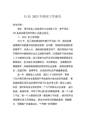 XX县2023年政府工作报告各位代表:现在,我代表县人民政府向大会报告工作,请予审议,XX县政协委员和列席人员提出意见。一、2022年工作回顾2022年,是三原发展进程中极不平凡的一年。面对多重超预期不利因素冲击的复杂形势,在市委、市政府和县委的坚强领导下,在县人大、县政协的监督支持下,我们坚持以习近平新时代中国特色社会主义思想为指导,以迎接学习宣传党的二十大精神为主线,深入贯彻习近平总书记来陕考察重要讲话重要指示,坚决落实“疫情要防住、经济要稳住、发展要安全”重要要求,高效统筹疫情防控和经济社会发展,统筹发展和安全,忠诚尽职、奋勇争先,全县经济社会平稳健康发展。这一年,最振奋人心的是,党的二...