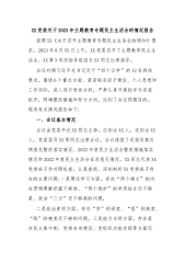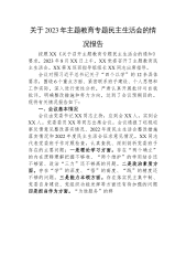 XX党委关于2023年主题教育专题民主生活会的情况报告按照XX《关于召开主题教育专题民主生活会的通知》要求,2023年8月XX日上午,XX党委召开了主题教育民主生活会。XX第X巡回指导组组长XX同志出席指导。会议对照习近平总书记关于“四个以学”的12条具体要求,围绕6个重点方面、紧密联系班子建设、个人思想和工作实际,深入进行党性分析,严肃认真开展批评与自我批评,明确整改措施和努力方向,达到了会议预期目的。现将有关情况报告如下:一、会议基本情况会议由党委书记XX同志主持,应到会XX人,实到会XX人。党委委员XX等同志出席会议。会议通报了巡视巡察反馈意见整改落实情况、2022年度民主生活会整改措施...