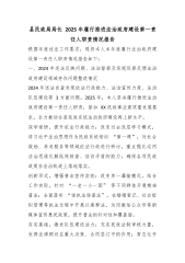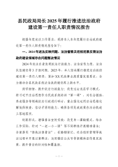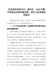 区民政局党组书记、副局长2025年履行推进法治政府建设第一责任人职责情况的报告根据年度述职工作要求,现将本人2025年度履行推进法治政府建设第一责任人职责情况报告如下:一、2025年政法反映问题、法治督察及巡视巡察反馈法治建设问题整改情况2024年查摆自查法治建设学习深度不足、行业普法宣传不够广泛、法治工作责任链条不够牢固等问题,2025年,我切实履行推进法治政府建设第一责任人职责,坚持问题导向、目标导向、结果导向,统筹推进问题整改到位。一是强化理论武装。将习近平法治思想纳入局党组理论学习中心组常态化学习机制,全年组织集中学法12次以上,切实提升领导班子和全体干部法治理论素养。二是强化普法宣传...