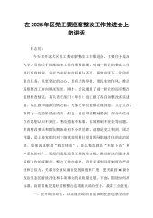 在XX区党工委巡察整改工作推进会上的讲话同志们:今天召开这次区党工委巡察整改工作推进会,主要任务是深入学习贯彻关于巡视巡察工作的重要论述,对前一阶段的整改工作进行复盘检视,分析当前存在的短板与不足,研究部署下一阶段的重点任务,以更坚定的决心、更有力的举措、更扎实的作风,推动巡察整改工作向纵深发展。刚才,会议通报了前一阶段的巡察整改监督检查情况,有关责任部门(单位)也汇报了各自的整改落实进展。从汇报和通报的情况看,大部分单位能够正视问题、立行立改,取得了一定的阶段性成效。但是,也必须清醒地看到,部分单位还存在思想认识不到位、整改措施不精准、长效机制不健全等问题,距离整改要求和群众期盼还有不小的差...