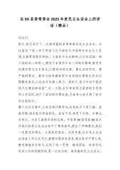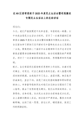 在XX县委常委会2025年度民主生活会上的讲话(精品)同志们:刚才,我们召开了一次高质量的县委常委会民主生活会。会议紧扣“深入学习贯彻习近平新时代中国特色社会主义思想,全面贯彻落实党的二十届四中全会精神,以打攻坚战、持久战的决心和恒心,锲而不舍落实中央八项规定精神,推进作风建设常态化长效化,以最坚决的态度、最扎实的作风、最严格的要求、最有力的举措抓好中央巡视反馈意见有关问题整改落实,以优良作风凝心聚力、真抓干,奋力开创中国式现代化建设新局面”这一主题,各位常委同志紧密联系思想和工作实际,进行了深刻的对照检查,开诚布公地开展了批评和自我批评。整个会议过程中,大家坚持问题导向,自我批评不遮不掩、直...