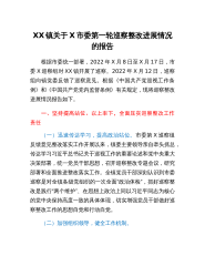 XX镇关于X市委第一轮巡察整改进展情况的报告根据市委统一部署,2022年X月8日至X月17日,市委X巡察组对XX镇开展了巡察。2022年X月12日,巡察组向镇党委反馈了巡察意见。根据《中国共产党巡视工作条例》和《中国共产党党内监督条例》有关规定,现将巡察整改进展情况报告如下。一、坚持提高站位、以上率下,全面压实巡察整改工作责任(一)迅速传达学习,提高政治站位。市委第X巡察组反馈意见整改落实工作开展以来,镇委主要领导亲自牵头抓总,传达学习习近平总书记关于巡视工作的重要论述和党中央重大决策部署,统一党员干部思想,召开巡察整改专题会议,研究部署和全面推进整改落实工作。全镇党员干部深刻认识到市委巡察是...