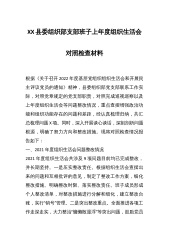 XX县委组织部支部班子上年度组织生活会对照检查材料根据《关于召开2022年度基层党组织组织生活会和开展民主评议党员的通知》精神,县委组织部党支部联系工作实际,对照党章规定的党支部职责,对照完成巡视巡察以及上年度组织生活会等问题整改情况,重点查摆增强政治功能和组织功能存在的问题和差距,经认真梳理归纳,共汇总梳理问题X项。同时,深入开展谈心谈话,深刻剖析问题根源,明确了努力方向和整改措施。现将对照检查情况报告如下:一、2021年度组织生活会问题整改情况2021年度组织生活会共涉及9项问题目前均已完成整改,并长期坚持。一是压实整改责任。根据组织生活会查摆出来的问题和互相批评的意见,制定了整改工作方案...