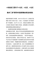X街道党工委关于X社区、X社区、X社区集体“三资”管理专项巡察整改情况的报告根据市委巡察工作部署,2022年9月至10月,区级交叉巡察第5组对X街道X社区、X社区、X社区集体“三资”管理开展了专项巡察。2023年X月10日,区级交叉巡察第5组向X街道党工委反馈了巡察工作情况。按照巡察工作有关要求,现将巡察整改进展情况报告如下。一、被巡察党组织履行巡察整改主体责任情况各被巡察社区党委、股份公司党支部高度重视巡察反馈问题,全面落实整改主体责任。街道党工委全面统筹,逐个指导,推动各被巡察单位整改落实。一是召开专题会议。组织召开社区党委会、股份公司党员大会,集体学习习近平总书记关于巡视巡察工作的重要论...