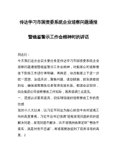 传达学习市国资委系统企业巡察问题通报暨镜鉴警示工作会精神时的讲话同志们:今天我们这次会议主要任务是传达学习市国资委系统企业巡察问题通报暨镜鉴警示工作会精神,对集团公司巡察整改下阶段工作进行再明确、再推进,动员集团上下进一步统一思想、达成共识,聚集问题、谋划措施,抓实抓细抓到位,确保巡察整改任务取得实效长效。根据会议安排,结合集团公司巡察整改工作实际,我再强调三点意见。一、思想认识要再提高,切实增强做好巡察整改工作的责任感党的十八大以来,以习近平同志为核心的党中央对巡视工作的高度重视,习近平总书记强调“巡视发现问题的目的是解决问题,发现问题不解决,比不巡视的效果还坏”“整改不落实,就是对党不忠诚...