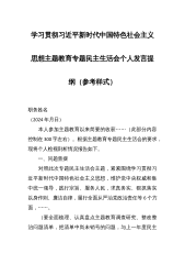 学习贯彻习近平新时代中国特色社会主义思想主题教育专题民主生活会个人发言提纲(参考样式)职务姓名(2024年月日) 本人参加主题教育以来简要的收获……(此部分内容控制在300字左右)。根据主题教育专题民主生活会的要求,现将个人检视剖析情况报告如下。 一、问题查摆 对照此次专题民主生活会主题,紧紧围绕学习贯彻习近平新时代中国特色社会主义思想,维护党中央权威和集中统一领导,践行宗旨、服务人民,求真务实、狠抓落实以身作则、廉洁自律,履行全面从严治党政治责任等6个方面,……。 (要全面梳理、认真盘点主题教育调查研究、整改整治问题清单,把清单中尚未销号的问题,与上一年度民主生活会、巡视巡察整改和审...