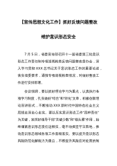 【宣传思想文化工作】抓好反馈问题整改维护意识形态安全7月5日,省委宣传部召开十一届省委第三轮意识形态工作责任制专项巡视检查反馈问题整改督办会,深入学习贯彻XXX总书记关于意识形态工作的重要论述,落实省委要求,通报专项巡视检查情况,对做好整改工作进行安排部署。会议强调,要以抓好理论学习为重点,认真执行各项学习制度,扎实做好“结合”和“转化”文章,积极创新理论宣讲形式,不断推动XXX新时代中国特色社会主义思想走深走心走实。要以压实意识形态工作“四种责任”为关键,发挥好领导干部“关键少数”和“领头雁”作用,始终绷紧意识形态责任这根弦,毫不动摇坚守主阵地,推动意识形态领域各项工作落细落实。要以提升意识...