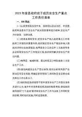 2023年度县政府班子成员安全生产重点工作责任清单一、XX同志(一)认真贯彻落实党中央、国务院以及自治区、市党委、政府和县委关于安全生产的决策部署和指示精神,安全生产方针政策、法律法规。(二)统筹发展和安全,把安全生产纳入政府重点工作和政府工作报告的重要内容,组织制定安全生产规划并纳入国民经济和社会发展规划,每季度至少主持召开1次政府常务会议听取安全生产工作情况汇报,组织研究解决安全生产突出问题。(三)每季度、敏感时期、重点时段至少带队检查1次安全生产工作。(四)推动构建安全生产责任体系,组织分析研判新产业新业态等安全风险,明确监督管理部门,组织制定县安委会成员单位工作任务分工。(五)组织制定...