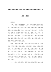 XX市自然资源局XX分局2025年党风廉政建设半年工作报告(精品)同志们:今天,我们召开2025年上半年工作暨党风廉政建设会议,主要任务是深入学习贯彻习近平总书记关于全面加强党的纪律建设的重要论述,总结回顾上半年工作,分析研判当前形势,安排部署下半年任务,动员全局上下进一步统一思想、凝聚共识,以更加坚定的决心、更加有力的举措,推动我局各项工作再上新台草阶,奋力夺取市区年度考核“双优秀”的优异成绩。刚才,我们一同观看了分局上半年工作的短片,共同见证了大家辛勤付出的成果。会议通报了2024年度的考核结果,并为获得荣誉的同志颁了奖,这既是肯定,更是激励。几位来自不同岗位、不同年龄段的同志作了交流发言...