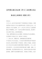 在市委X届X次全体(扩大)会议第X次全体会议上的讲话(经济工作)同志们:今天上午,X书记代表市委作了市委常委会工作报告,并围绕贯彻中央经济工作会议精神和省委十五届五次全会、省委经济工作会议精神,对下一步全市工作作出了全面部署提出了明确要求。等一下X书记还要作总结讲话,我们要一并认真学习领会,抓好贯彻落实。下面,就贯彻落实本次会议精神,特别是X书记讲话精神,扎实做好今年经济工作,我先讲三点意见。一、深化认识、凝聚共识,准确把握当前发展形势中央经济工作会议指出,今年经济发展形势依然严峻复杂但总体上有利条件强于不利因素,机遇大于挑战。省委经济工作会议对全省经济发展形势做了精准研判。上午,X书记在讲话...