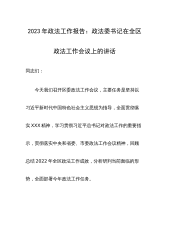 2023年政法工作报告:政法委书记在全区政法工作会议上的讲话同志们:今天我们召开区委政法工作会议,主要任务是坚持以习近平新时代中国特色社会主义思想为指导,全面贯彻落实XXX精神,学习贯彻习近平总书记对政法工作的重要指示,贯彻落实中央和省委、市委政法工作会议精神,回顾总结2022年全区政法工作成效,分析研判当前面临的形势,全面部署今年政法工作任务。 近段时间以来,党中央和省、市、区委对今年政法工作先后作出重要部署。1月X日,中央政法工作会议召开,会前习近平总书记对政法工作作出重要指示,明确提出了当前和今后一个时期做好政法工作的重要要求,为进一步做好新时代政法工作提供了根本遵循;中央政法工作会议...
