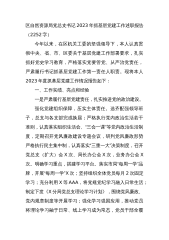 区自然资源局党总支书记2023年抓基层党建工作述职报告(2252字)今年以来,在区机关工委的坚强领导下,本人认真贯彻中央、省、市、区委关于基层党建工作部署要求,扎实抓好党史学习教育,严格落实党要管党、从严治党责任,严肃履行书记抓基层党建工作第一责任人职责。现将本人2023年度抓基层党建工作情况报告如下:一、工作实绩、亮点和经验一是严肃履行基层党建责任,扎实推进党的政治建设。强化党建组织保障,压实主体责任。选齐配强领导班子,总支与各支部完成换届;严格执行党内政治生活若干准则,认真落实组织生活会、“三会一课”等党内政治生活制度,定期召开党风廉政建设专题会议,研判党风廉政形势严格执行民主集中制,认真...