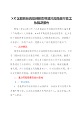 XX区教育系统意识形态领域风险隐患排查工作情况报告根据区委××部《关于开展意识形态领域风险隐患全面排查工作的通知》文件精神,××教育局党组坚持底线思维,扎实组织开展好教育系统意识形态领域风险隐患排查工作,切实做到抓早抓小,防患于未然。现将相关工作开展情况汇报如下。一、总体情况局党组高度重视意识形态领域风险隐患全面排查工作,下发专门通知组织全区各基层学校、幼儿园,从重点领域、敏感人群、主要阵地等三方面,对本单位意识形态工作中存在的风险隐患进行了分析研判,对风险点进行逐一排查,确保底数清、情况明,共计发现重点风险隐患××个。针对发现的问题,逐一制定化解防范措施,确保教育系统意识形态领域平稳有序。二...
