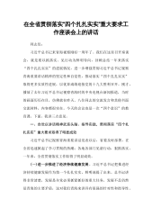 在全省贯彻落实“四个扎扎实实”重大要求工作座谈会上的讲话同志们:习近平总书记来青海视察刚好一周年了。我们在这里召开座谈会,就是要以抓落实、见行动为鲜明导向,回顾总结一年来落实“四个扎扎实实”的进展情况,进一步增强贯彻习近平总书记视察青海重要讲话精神的坚定性和自觉性,推动落实“四个扎扎实实”取得更多实质性进展,以优异成绩迎接党的十九大胜利召开。刚才,播放了去年习近平总书记视察青海时的中央电视台新闻报道,当时的画面历历在目,仿佛就在昨天。八位同志的交流发言和其他书面交流材料,内容都很实在。今天的会议也是一次“四个意识”的教育课。下面,我讲三点意见。一、自觉以讲话精神武装头脑、指导实践,贯彻落实“四...