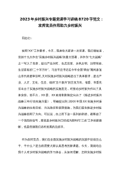 2023年乡村振兴专题党课学习讲稿8720字范文:发挥党员作用助力乡村振兴同志们:按照“XX”工作要求,今天,我来给大家讲一次党课。我们都知道,党的十九大作出“实施乡村振兴战略”的重大部署,并作为“七大战略”之一写入了党章,提出产业兴旺、生态宜居、乡风文明、治理有效、生活富裕的“二十字方针”。习近平总书记在今年全国“两会”期间参加山东代表团审议时,又对实施乡村振兴战略提出了具体要求,提出产业、人才、文化、生态、组织“五个振兴”的主攻方向。省委、市委先后出台了实施乡村振兴战略的实施意见,对推动乡村振兴作出了具体安排。前不久,XX委、XX政府刚刚制定出台了《推进乡村振兴战略三年行动实施方案》,明确...