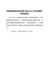 市场监管局机关党支部2021年上半年党建工作总结范文今年上半年,我局党支部在县委、县政府的领导下,在县直属党委的具体指导下,以加强党的执政能力建设为主线,以机关作风建设和效能建设为重点,认真抓好党建工作,以党建促各项工作的开展,现将这半年来党支部开展工作情况总结如下:一、坚持学习,保持队伍先进性、纯洁性按照学习好、宣传够、研究透、转化快的要求,深入推进学习型党组织建设,全面提升党员干部整体素质。一是按照县委领导班子思想政治建设活动安排,深入推进党史学习教育。全体党员积极参与,认真完成各项规定工作,组织集中学习x次,专题讨论x次,发放征求意见表x份,梳理汇总意见、建议x条,开展交心谈心x多人次,...
