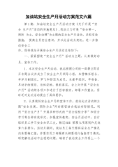 加油站安全生产月活动方案范文六篇第1篇:加油站安全生产月活动方案《关于开展“安全生产月"活动的实施意见》,我站大力开展“安全第一,预防为主,综合治理"为主题的安全生产月活动,采取有效措施,提高全员安全意识,并以此活动为契机,进一步推动安全工作,现将我站开展安全生产月活动总结如下:一、紧紧围绕“安全生产月”活动为主题,认真做好动员、宣传工作。1、本次安全生产月活动,我站按照公司统一部署立即召开专题会议并成立了安全生产月领导小组,朱雪梅任组长,李洋为副组长,罗飞和彭珏为成员。本着早组织、早准备、早动手的原则、总体安排,狠抓落实。会上对开展“安全生产月”活动的各项工作进行了目标落实,部署工作重点,同...