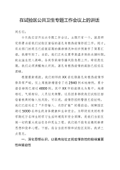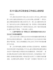 在XX县公共卫生安全工作会议上的讲话同志们:今天,我们在这里召开全县公共卫生安全工作会议,主要任务是深入分析当前我县面临的公共卫生安全形势,全面部署下一阶段以基孔肯雅热疫情防控为重点的各项工作。刚才,县卫健局的同志传达了省市有关会议和文件精神,通报了前一阶段的工作情况;XX镇和县城管执法局的同志作了很好的交流发言,分享了他们的经验做法,值得大家学习借鉴。下面,我讲三点意见。一、认清严峻形势,统一思想认识,深刻把握做好当前公共卫生安全工作的极端重要性公共卫生安全是人民群众生命安全和身体健康的重要保障,是经济社会稳定发展的基石。当前,我县的公共卫生安全体系正面临新的严峻考验。我们必须清醒地认识到,...
