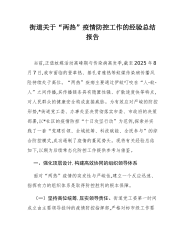街道关于“两热”疫情防控工作的经验总结报告当前,正值蚊媒活动高峰期与传染病高发季,截至2025年8月7日,我市面临的登革热、基孔肯雅热等蚊媒传染病传播风险持续处于高位。“两热”疾病主要通过伊蚊叮咬在“人-蚊-人”之间传播,其传播链条具有隐匿性强、扩散速度快等特点,对人民群众的健康安全构成直接威胁。为有效应对严峻的防控形势,*街道党工委、办事处坚决贯彻落实市委、市政府的决策部署,以*社区的疫情防控“十日攻坚行动”为范例,探索并实践了一套“党建引领、全域统筹、科技赋能、全民参与”的综合防控模式,成功遏制了疫情的蔓延势头。现将有关经验总结如下,以期为后续常态化防控工作提供参考与借鉴。一、强化顶层设计...