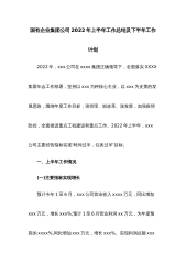 国有企业集团公司2022年上半年工作总结及下半年工作计划2022年,xxx公司在xxxx集团正确领导下,全面落实XXXX集团年会工作部署,坚持以xxx为种核心主业,以xxx为支撑的发展思路,围绕年度工作目标,强管理、抓改革、谋发展,加强疫情防控,全面推进重点工程建设和重点工作。2022年上半年,xxx公司主要经营指标实现“时间过半,任务过半”目标。一、上半年工作情况(一)主要指标实现增长预计今年1至6月,xxx公司营业收入xxxx万元,同比增加xxx万元,增长xxx%;预计1至6月营业利润xx万元,为年度预算的xxxx%,同比增加xxx万元,增长xxx%。实现利润总额xxx万元,较上年同期增加...