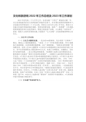 文化和旅游局2022年工作总结及2023年工作谋划2022年是党的二十大召开之年,也是实施“十四五”规划的关键一年。市文化和旅游局在省文化和旅游厅的指导支持下,在市委市政府的坚强领导下,以迎接宣传贯彻党的二十大为主线,坚持以人民为中心的工作导向,继续大力实施文化强市和旅游强市战略,坚持高质量发展,按照“一体两翼”工作思路,统筹疫情防控和行业复苏振兴,围绕文旅创意产业链,大力推进“双招双引”,促成一批重大文旅项目落地实施,全面提升“五大宜城”文化旅游能级和核心竞争力。一、2022年工作总结(一)文化艺术繁荣发展。一是办好***展演周。充分利用“互联网+”模式,侧重云上展演展播展览,“喜迎二十大”...