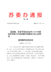 苏委办通报第3期中共苏州市委办公室2020年3月5日蓝绍敏、李亚平同志在全市2019年度综合考核工作总结暨作风建设大会上的讲话蓝绍敏同志的讲话(2020年3月5日)今天,我们召开全市2019年度综合考核工作总结暨作风建设大会。这次大会是在举国上下紧密团结在以习近平同志为核心的党中央周围,团结一心、众志成城,抗击新冠肺炎疫情、统筹经济社会发展的非常时期,我市召开的一次非同寻常的大会。在这场疫情防控人民战争、总体战、阻击战中,苏州干部焕发出了“越是艰险越向前”的革命意志,展现出了“再创火红年代”的精气神。同时间赛跑、与病魔较量,把失去的时间抢回来、把落下的任务补起来、把发展的节奏拉上来,成为了全市...