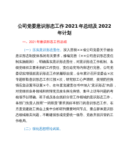 公司党委意识形态工作2021年总结及2022年计划一、2021年意识形态工作总结(一)压实意识形态责任。深入贯彻××省公司党委关于健全意识形态制度体系的有关要求,修编完善《××公司意识形态责任制实施细则》,明确落实意识形态责任,对意识形态工作机制、各级党组织主要承担的工作责任、责任追究等内容进行完善。公司党委切实增强抓意识形态工作的履职自觉,全年累计召开党委会×次专题听取意识形态工作汇报×次,研究职工心声调研、疫情防控舆情应急议案等议案×个。在年度党建责任书中纳入”意识形态”内容,对党组织业务领域和所辖党员发生舆论舆情、集中上访等问题的考核项予以明确。班子成员各自抓好分管工作领域的意识形态工作...