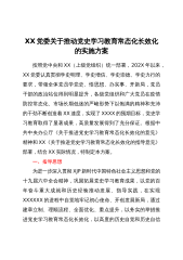 XX党委关于推动党史学习教育常态化长效化的实施方案按照党中央和XX(上级党组织)统一部署,202X年以来,XX党委认真贯彻学史明理、学史增信、学史崇德、学史力行的要求,带领全体党员学党史、悟思想、办实事、开新局,党员干部的政治站位得到明显提升,各级党组织和广大党员在疫情防控常态化、市场长期低迷的严峻形势下以饱满的精神和充沛的干劲不断创造着XX速度,实现了XXXX的预期目标,党史学习教育取得了显著成果,高质量发展得到了充分保证。根据中共中央办公厅《关于推进党史学习教育常态化长效化的意见》精神和XX《关于推进党史学习教育常态化长效化的指导意见》部署,结合XX实际情况,特制定本方案。一、指导思想为进...