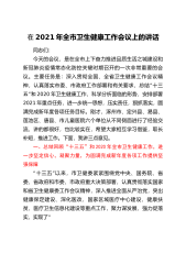 在2021年全市卫生健康工作会议上的讲话同志们:今天的会议,是在全市上下奋力推进品质生活之城建设和新冠肺炎疫情常态化防控关键时期召开的一次非常重要的会议。主要任务是:深入贯彻全国、全省卫生健康工作会议精”神,认真落实市委、市政府工作部署和有关要求,总结十三”五和2020年卫生健康工作,科学分析面临的形势,安排部署2021年重点任务,进一步统一思想,压实责任,狠抓落实,圆满完成新年度各项任务目标。刚才,涿州市、定兴县、易县、莲池区、唐县、市儿童医院六个单位从不同侧面进行了经验交流,讲的都很好,也比较实在,希望大家相互学习借鉴,取长补短,推进工作。下面,我讲三点意见。一、总结回顾“十三五”和202...