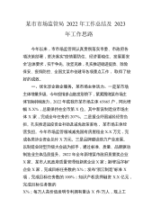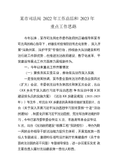 某市司法局2022年工作总结和2023年重点工作思路今年以来,某市司法局在市委市政府的正确领导和某市司法局的精心指导下,积极应对疫情防控常态化形势,深入开展“法助共富、法护平安”专项行动,持续放大法治建设和司法行政工作新优势,在推进法治政府建设、数字化改革、平安建设等重点工作方面努力展现新作为。一、今年以来重点工作开展情况(一)聚焦夯实主责主业,推动依法治市深入实践一是强化统筹协调。某市委全面依法治市委员会第四次(扩大)会议、市委依法治市办第四次和第五次会议,出台《XX乡关于深入践行习近平法治思想争当法治中国X区建设排头兵的实施方案》《法治XX乡建设规划(2021-2025年)》等文件,对法治...