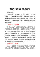 疫情防控期间在外党员思想汇报敬爱的党组织:疫情就是命令,防控就是责任。作为一名党员,在党组织的教育之下,我每天关注新闻热点,了解疫情的最新动态,把思想和行动统一到党中央的部署要求上来,立足工作岗位、勇于担当作为,力争把工作做细、做实,现就把疫情期间本人的思想进行汇报。一是坚定信心,抗击疫情。信心是生命之泉,越是困难越要充满信心,百折不挠。此次疫情防控工作是复杂艰巨的,我们要做好充分的思想准备和工作准备,始终站在防控疫情斗争第一线,把保护人民群众生命安全和身体健康放在第一位,树立打赢防控的信心,把防范的工作和措施做得更好,坚信在党中央坚强领导下,在全国人员的支持下、在医疗战线人员的艰苦努力下,坚...