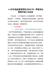 ××区市场监督管理局2022年一季度优化营商环境工作总结今年以来,××市场监管×立足职能职责,勇于探索、精准发力、大胆实践,不断提高市场监管效能,激发市场活力和社会创造力,维护市场竞争秩序,助力打造市场化法治化、国际化的一流营商环境。一、工作开展情况(一)立足部门职能,守牢优化营商环境安全底线。一是守牢疫情防控底线。严格落实重点人群定期核酸检测要求,冷链从业人员核酸检测完成率100%。组织进口非冷链集装箱企业应急演练,妥善处置××集团进口××××阳性事件,相关经验做法在省、市工作会议上被通报表扬建成××区进口非冷链集装箱货物集中监管仓并投入使用。对开发区药店进行多轮次、全覆盖督导检查,发现问题...