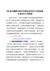 XX县卫生健康局2022年上半年工作总结及下半年工作谋划今年以来,XX县卫生健康工作在县委、县政府的正确领导和市卫健委的大力指导下,坚持新时代卫生健康工作方针,以“三重四创五优化”“三基”建设年为动力,统筹做好疫情防控、公共卫生服务体系改革、基层医疗卫生服务能力提升、中医药传承创新发展等重点工作,各级医疗机构基础设施实现跨越式提升,整体服务水平有了显著提升,人民群众健康水平有了明显改善。一、2022年上半年主要工作完成情况(一)重点工作完成情况1、严格做好常态化疫情防控工作。一是进一步加强院感管理。卫健局及各医疗机构也成立了三级防控组织,设立了院感专职人员和巡查、督导人员,确保院感防控措施落实...
