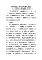 做好防疫工作保护好群众安全——记XX区卫生健康局党委委员、副局长XX“作为党员领导干部,本身就要身先士卒”,在XX区卫生系统新型冠状病毒疫情防控党员应急分队动员会议上XX区卫生健康局党委委员、副局长XX如是说。而他本人自除夕节至今,每天废寝忘食,休息都不顾上,却总是能够出色完成组织交付的任务。冲在最前“自己要冲到最前线,做好防疫工作,保护好群众安全!”在局党委会上,XX这样表态。作为分管领导,肩上的担子重,压力大。XX在春节也没有睡好一个囫囵觉,判形势、巡地点、查物资、审材料,指导乡镇、街道和村、社区做好武汉回来人员的摸底,指导基层卫健人员严格按照流程开展工作,指导疾控人员做好公共场所的消毒工...