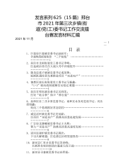 发言系列625(15篇)邢台市2021年第三次乡镇(街道)党(工)委书记工作交流擂台赛发言材料汇编2021年11月—1—目录1.巨鹿县巨鹿镇党委书记赵跃军:全面构筑疫情防控“三个防线”…………………………………………………12.南宫市北胡街道党工委书记李峰:扛起政治责任在大战大考中淬炼提升…………………………………………23.隆尧县莲子镇镇党委书记成英锋:抢抓机遇攻坚克难推进项目“双进双产”……………………………………34.襄都区南长街街道党工委书记马振鑫:“1+3”联动机制破解信访稳定难题…………………………………………45.南宫市明化镇党委书记吴利美:打好“组合拳”保卫“邢台蓝”……………...