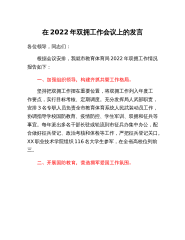 在2022年双拥工作会议上的发言各位领导,同志们:根据会议安排,我就市教育体育局2022年双拥工作情况报告如下:一、加强组织领导,构建齐抓共管工作格局。坚持把双拥工作摆在重要位置,将双拥工作列入年度工作要点,实行目标考核、定期调度。充分发挥局人武部职责,安排3名专职人员负责全市教育体育系统人民武装动员工作,协调指导学校国防教育、疫情防控、学生军训、双拥和征兵等事宜。每年派出多名干部长驻或轮流到市征兵办集中办公,配合做好征兵登记、政治考核和体检等工作,严把征兵登记关口。XX职业技术学院组织116名大学生参军,在全省高校位列前三。二、开展国防教育,营造拥军爱国工作氛围。XX市实验学校、XX市第二实...