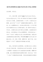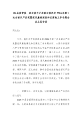 XX县委常委、政法委书记在政法委机关2026年第1次全面从严治党暨党风廉政建设和反腐败工作专题会议上的讲话同志们: 今天,我们召开县委政法委2026年第一次全面从严治党暨党风廉政建设和反腐败工作专题会议,主要任务是深入学习贯彻习近平总书记在二十届中央纪委五次全会上的重要讲话精神,全面落实省纪委十一届六次全会、市纪委十二届六次全会、县纪委十四届六次全会部署要求,总结2025年我委全面从严治党、党风廉政建设和反腐败工作,分析当前形势,安排部署下阶段重点任务,进一步统一思想、凝聚共识、压实责任,推动全县政法系统全面从严治党向纵深发展、向基层延伸。刚才,我们集体学习了各级纪委全会核心精神,回顾了去年...