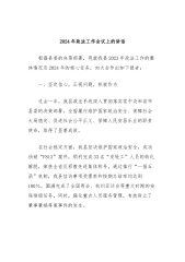在第一次政法委员会全体(扩大)会议暨政法系统党风廉政建设工作会议上的讲话同志们:今天这次会议是2024年政法委员会第一次全体(扩大)工作会议暨政法系统党风廉政建设工作会议。之所以放在这个时间节点来开,主要有三点考虑:一是2024年第一季度即将结束,各项工作都已步入正轨,借此可以小结一下以便接下来更好推进;二是近期中央、省委、市委政法工作会议、县委工作会议相继召开,为了更好的抓好贯彻和落实;三是抓好党风廉政建设是一项十分重要的工作也是我们打造忠诚、干净、担当的政法铁军的有力举措。总之一句话,就是要动员全县政法系统在2024年攻坚克难、奋勇争先,确保高质量完成全年目标任务。去年12月召开的政法委员...