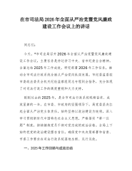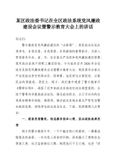 某区政法委书记在全区政法系统党风廉政建设会议暨警示教育大会上的讲话同志们:警示教育是党风廉政建设的“必修课”,更是政法队伍自我净化、自我完善、自我革新、自我提高的重要抓手。为深入贯彻落实中央、省、市、区全面从严治党和党风廉政建设部署,筑牢政法系统干部职工廉洁防线,今天组织召开2026年全区政法系统党风廉政建设会议暨警示教育大会,既是落实全面从严治党政治责任的再动员、再部署,也是深化以案促改、以案促治的再推进、再发力。刚才,我们集中观看了警示教育片《警钟长鸣》,通报了近年来政法系统违纪违法典型案例。全体干警要切实提高政治站位,强化政治担当,以刀刃向内的自我革命精神补短板、强弱项,推动政法系统全面...
