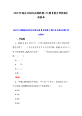 (两套题)2025年学习全国“两会”精神政府工作报告专题测试题100题【附:答案及解析】与两会应知应会题225题【附答案】2025年学习全国“两会”精神政府工作报告专题测试题100题【附:答案及解析】一、单选题(50题)1.2025年是“十四五”规划的().A.开局之年B.攻坚之年C.收官之年D.评估之年答案:C。文中明确指出"今年是‘十四五‘规划收官之年”。2.2025年政府工作以()为指导。A.邓小平理论B.习近平新时代中国特色社会主义思想C.“三个代表”重要思想D.科学发展观答案:B.原文表述为"做好政府工作,要在以习近平同志为核心的党中央坚强领导下,以习近平新时代中国特色社会主义思想为...