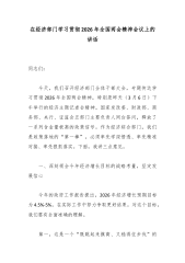 凝心聚力抓落实奋力冲刺开新局——在传达学习贯彻2026年全国两会精神会议上的讲话同志们: 今天,我们召开全体干部大会,主要任务是传达学习2026年全国两会精神,特别是李强总理所作的政府工作报告,安排部署贯彻落实工作。 3月5日,十四届全国人大四次会议在京开幕。总理作的政府工作报告,站位高远、求真务实、内容丰富,是一份非常有高度、有深度、有温度的好报告。报告指出,“全年经济社会发展主要目标任务顺利完成,‘十四五’圆满收官,中国式现代化迈出新的坚实步伐”。作为“十五五”开局之年的施政纲领,报告既是对过去五年成就的系统总结,更是对未来五年发展的战略擘画。下面,我就抓好学习贯彻,讲三点意见。 一...