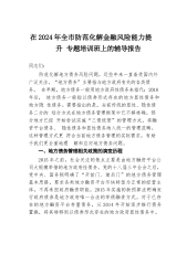 镇关于贯彻落实“汛九条”工作开展情况报告为进一步加强镇汛期安全防范工作,自4月进入汛期以来,*深入学习宣传贯彻《加强汛期安全防范工作九条措施》,压实工作责任,完善制度建设,提质安置点建设,开展群众避险转移,全方位扎实做好2024年防汛防地灾工作,现将相关情况汇报如下。一、乡镇基本情况*镇全镇面积*平方公里,户籍人口*人,常住人口*余人。*镇辖区内共有景区4个(*、*、*、*),农家乐*家、煤矿企业*家、非煤矿山*座、地灾点*个、山洪点*个、小水电*家、铁索桥*座、河流沟渠*条。二、工作开展情况(一)严阵以待,确保应急响应到位一是成立防汛专班,压实工作职责。汛期内镇党委、政府特别成立防汛专班,指...