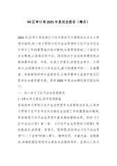XX区审计局2025年度述法报告(精品)2025年,区审计局坚持以习近平新时代中国特色社会主义思想为指导,深入学习贯彻习近平法治思想和习近平总书记关于审计工作的重要指示批示精神,全面贯彻党的二十届四中全会精神,认真落实党中央、国务院关于法治政府建设的决策部署和省委、市委、区委工作要求,坚持依法审计、文明审计,全面推进审计工作法治化,着力构建集中统一、全面覆盖、权威高效的审计监督体系,以高质量审计监督护航全区经济社会高质量发展。现将2025年度法治建设情况报告如下:一、深入学习习近平法治思想情况(一)带头学习领会,筑牢思想根基坚持把学习贯彻习近平法治思想作为首要政治任务,认真学习贯彻习近平总书记...