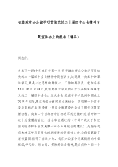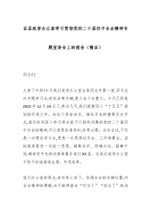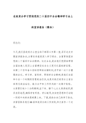 在政府办学习贯彻党的二十届四中全会精神学习会上的宣讲报告(精品)同志们:今天,我们县政府办公室全体干部职工齐聚一堂,召开这次专题宣讲报告会,主要任务就是深入学习领会、全面贯彻落实党的二十届四中全会精神。这次全会,是在我们党团结带领全国各族人民迈上全面建设社会主义现代化国家新征程、向第二个百年奋斗目标进军的关键时刻,召开的一次十分重要的会议。学习好、宣传好、贯彻好全会精神,是我们当前和今后一个时期的首要政治任务,也是对我们政府办公室全体同志政治站位、能力水平和工作作风的一次集中检验。大家要打起十二分的精神,坐下来、静下心,认认真真地学,联系实际地思,确保学有所获、学以致用,切实把思想和行动统一到...